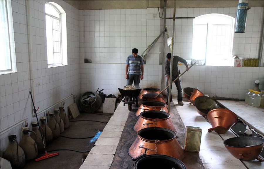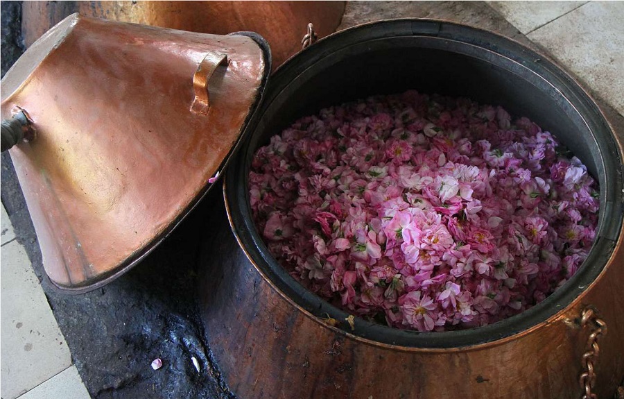 Les nouvelles roses y sont cueillies à la main chaque matin avant les fortes chaleurs et acheminées vers les ateliers de distillation. Les pétales fraîchement cueillis sont immergés d’eau et versés dans des cuves de cuivre chauffées à température constante durant plusieurs heures. L’eau de rose ainsi évaporée est recueillie et mise en bouteille, ou réinjectée pour une seconde distillation destinée à produire une huile essentielle pure.