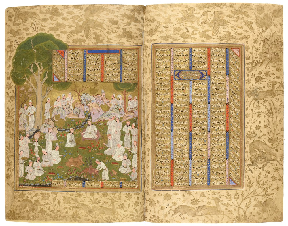 The miniature, which is often one of the earliest illustrations in the manuscripts of the Shâhnâmeh, stands out on a page with margins decorated with gilded plants and animals.
