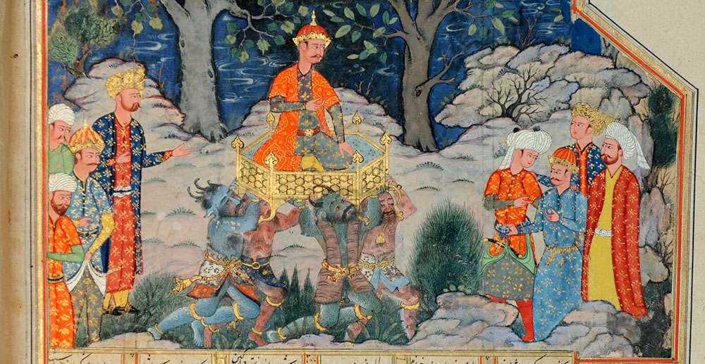 Jamshid sur son trône porté par des divs (démons). Détail d’une illustration tirée d’un manuscrit du Shāhnameh (Royal Collection Trust)