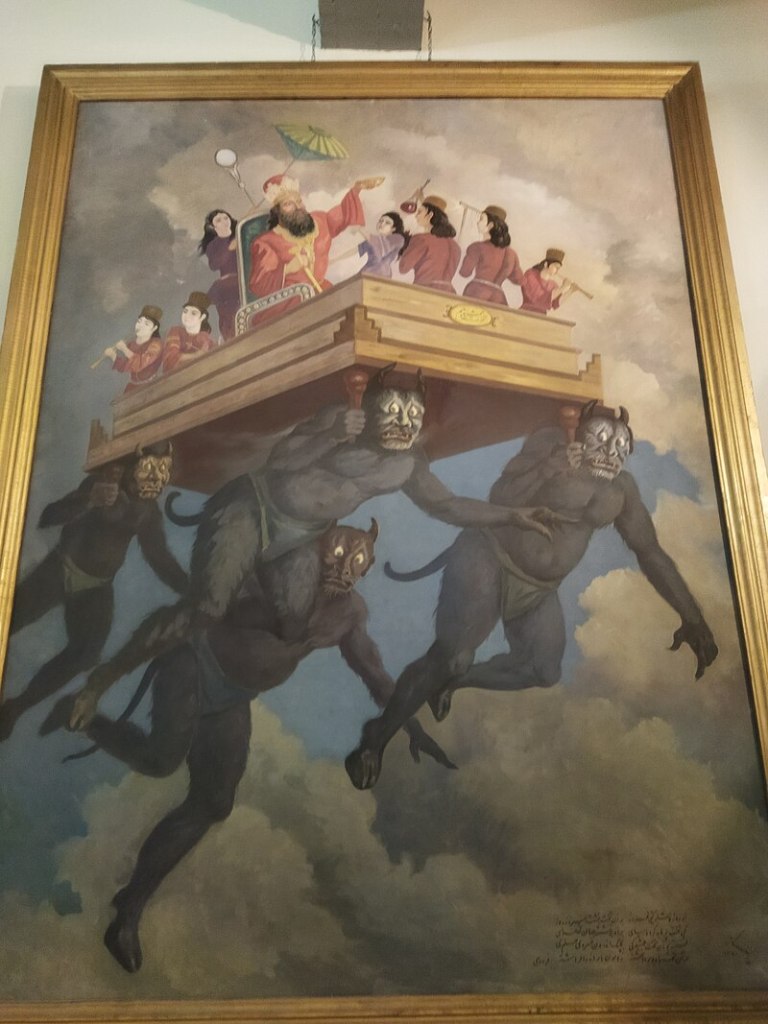 Tableau, Jamshid sur son trône porté par des démons. Exposé dans le mausolée de Ferdowsi à Tus Mashhad, Iran.