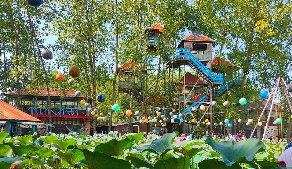Khommam tree gazebo was built on top of 20 trees with dimensions of 8, 10 and 12 meters. The area of these pavilions has a restaurant, a swimming pool and an artificial lake covered with a swamp lily plant.